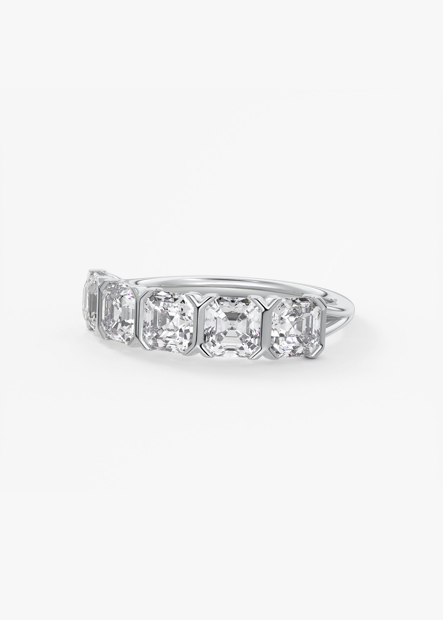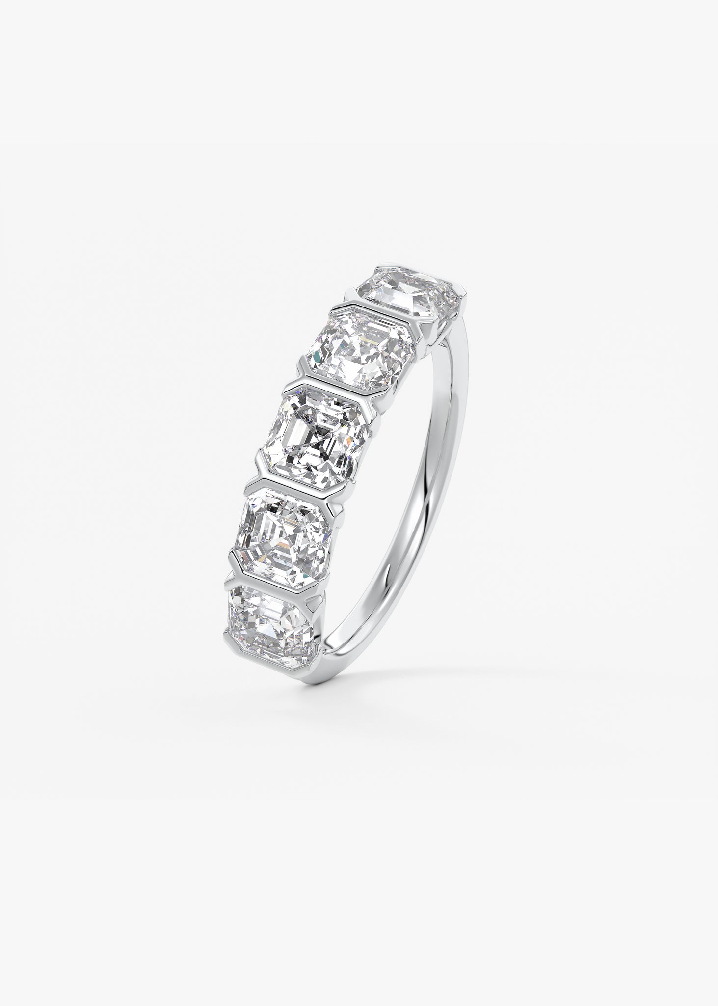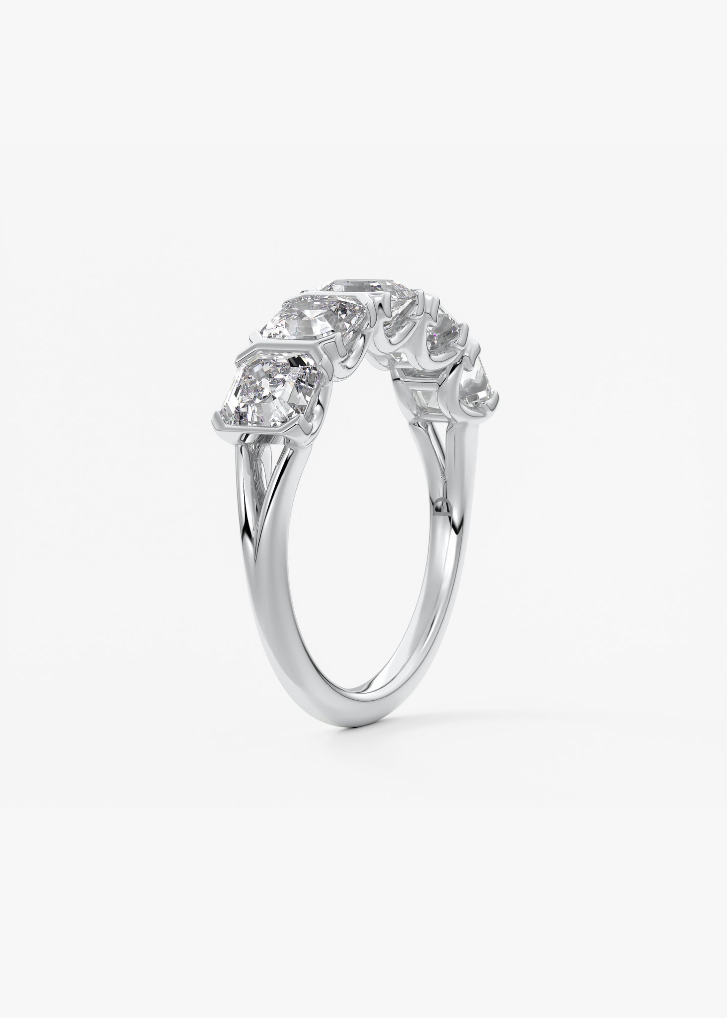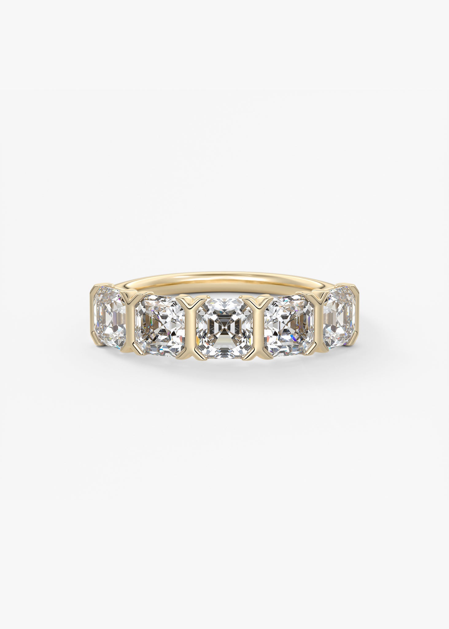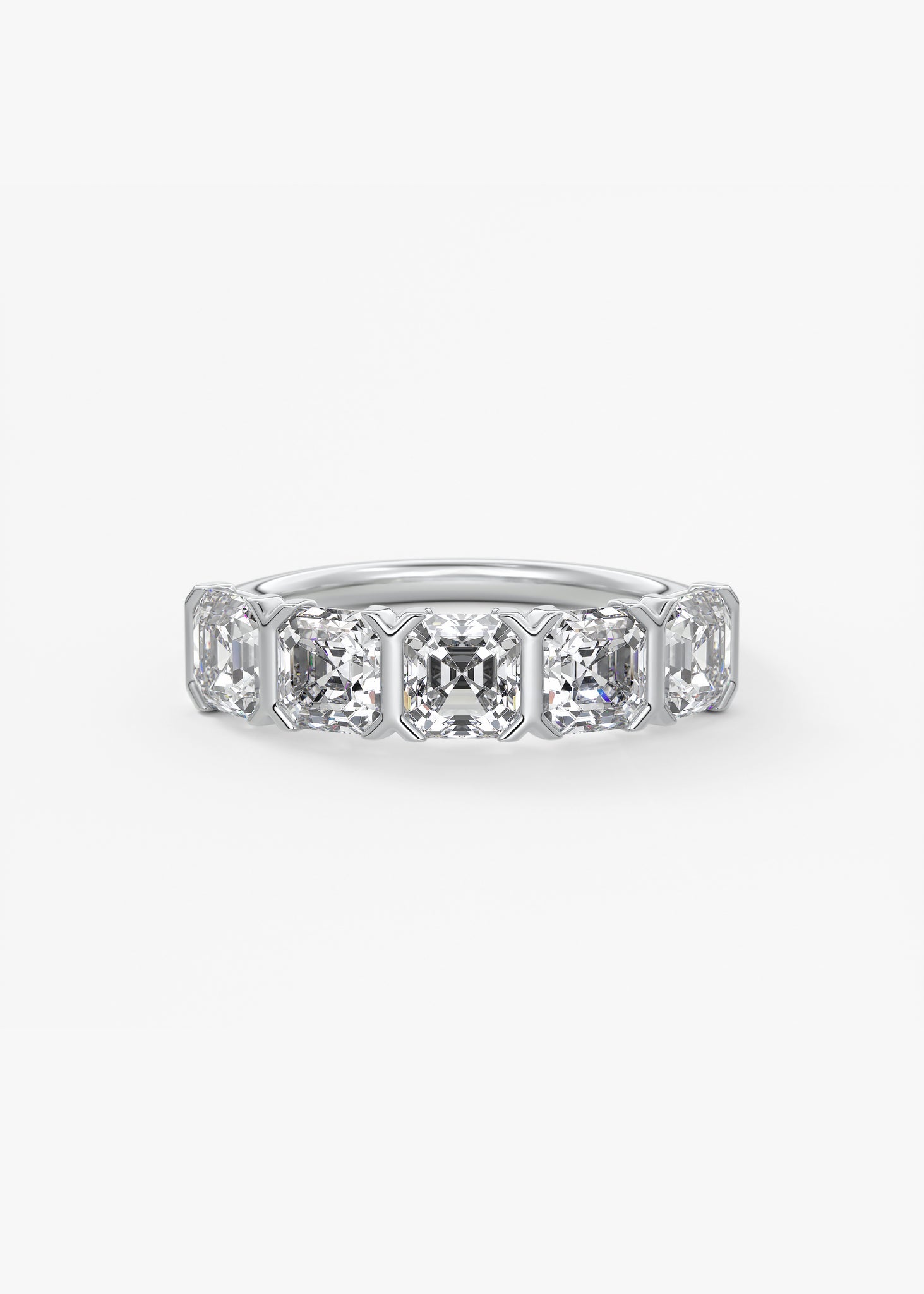This diamond-forward five-stone band features 2.5 carats of Asscher cut diamonds, framed in barely-there half bezels to spotlight their crisp, clipped corners. With bold geometry and a low-profile silhouette, it delivers maximum impact with everyday ease. The perfect right-hand, anniversary, or just-because ring. Modern. Sculptural. Unapologetically brilliant. It might just become your favorite forever piece.