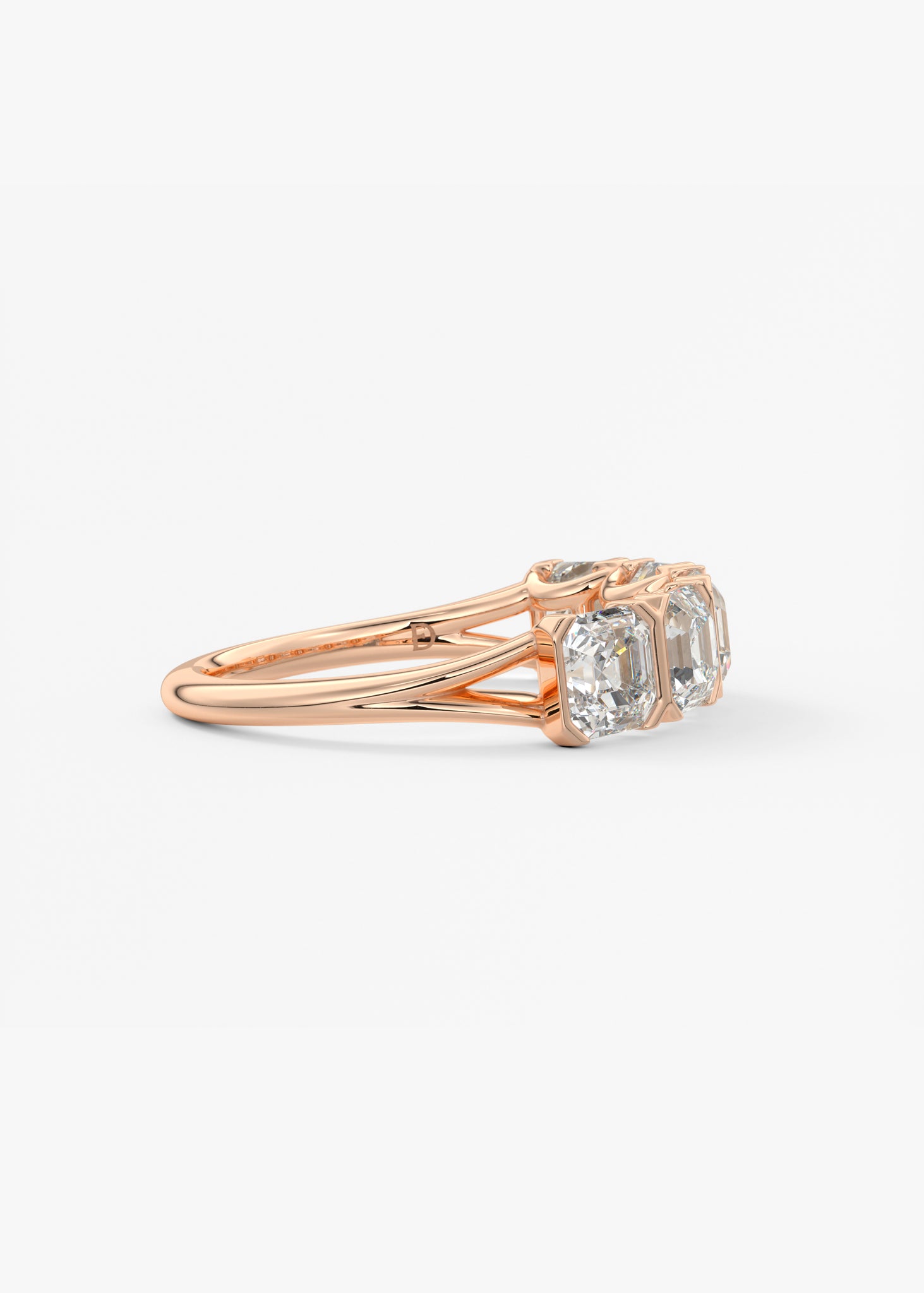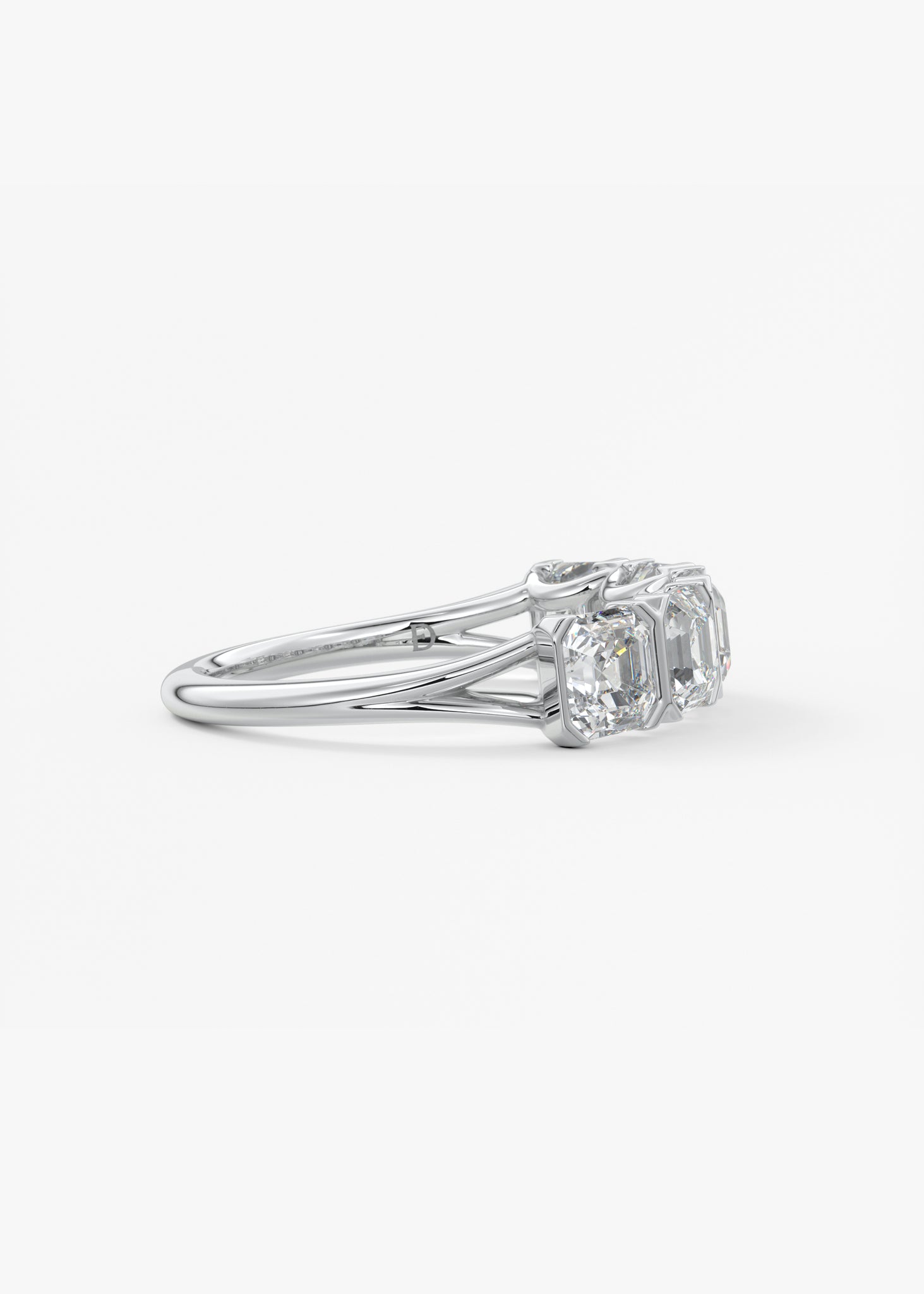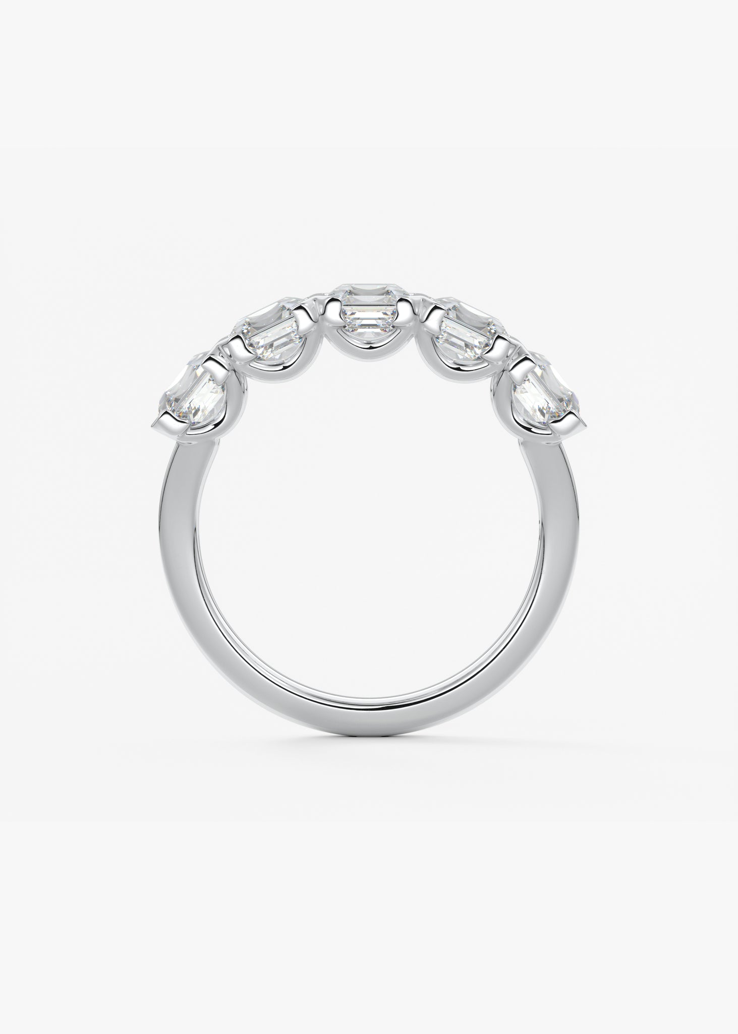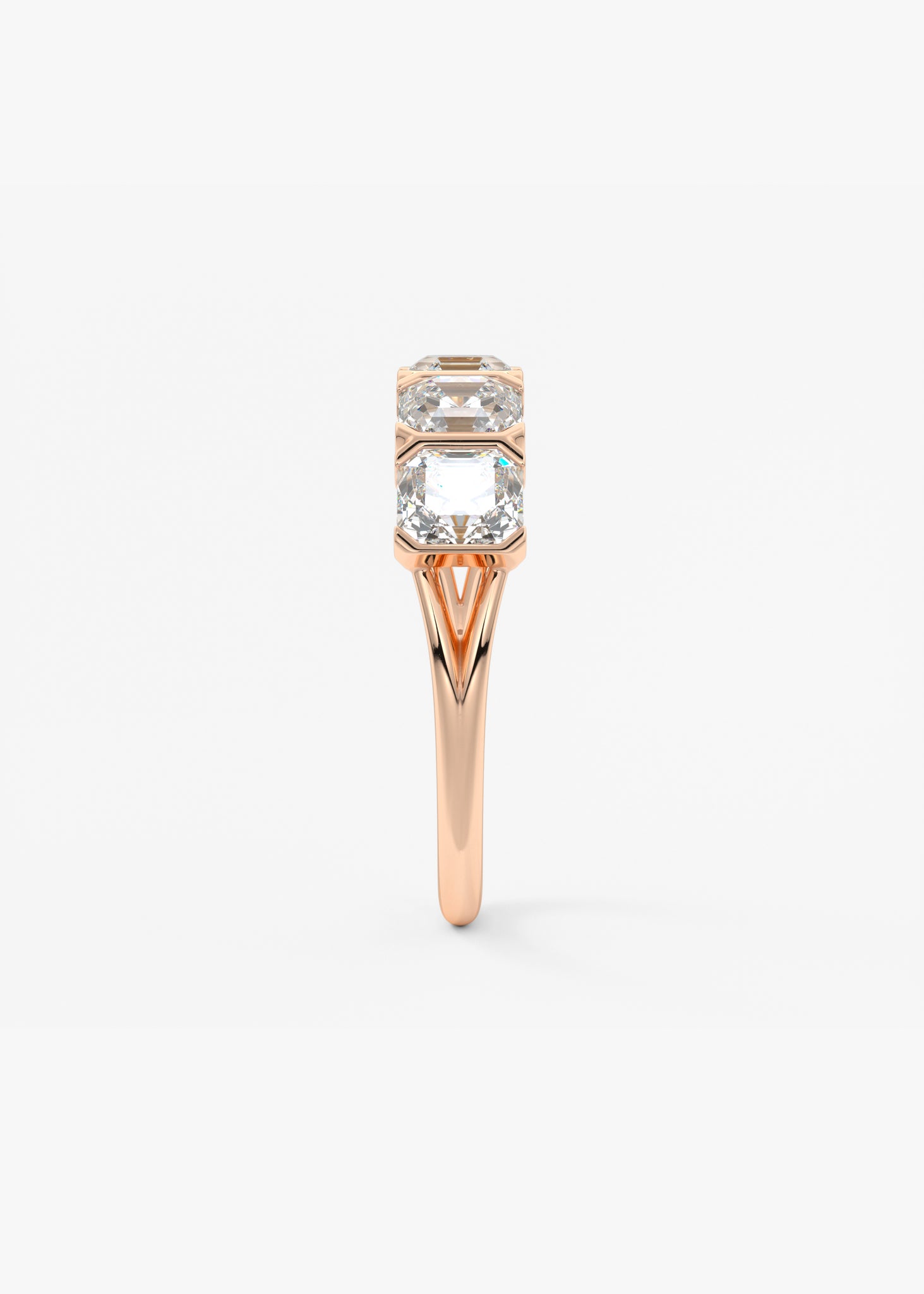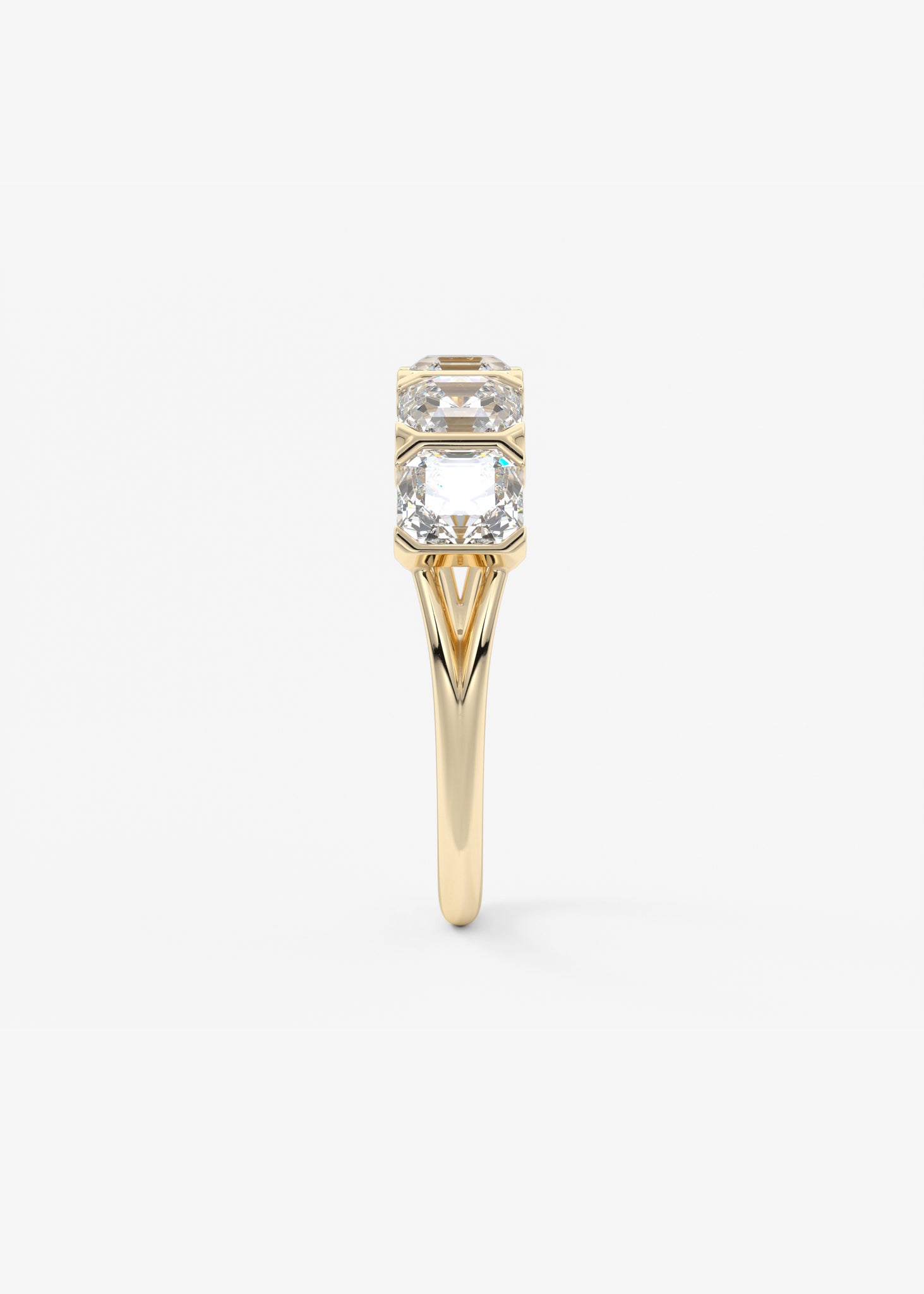 This diamond-forward five-stone band features 2.5 carats of Asscher cut diamonds, framed in barely-there half bezels to spotlight their crisp, clipped corners. With bold geometry and a low-profile silhouette, it delivers maximum impact with everyday ease. The perfect right-hand, anniversary, or just-because ring. Modern. Sculptural. Unapologetically brilliant. It might just become your favorite forever piece.